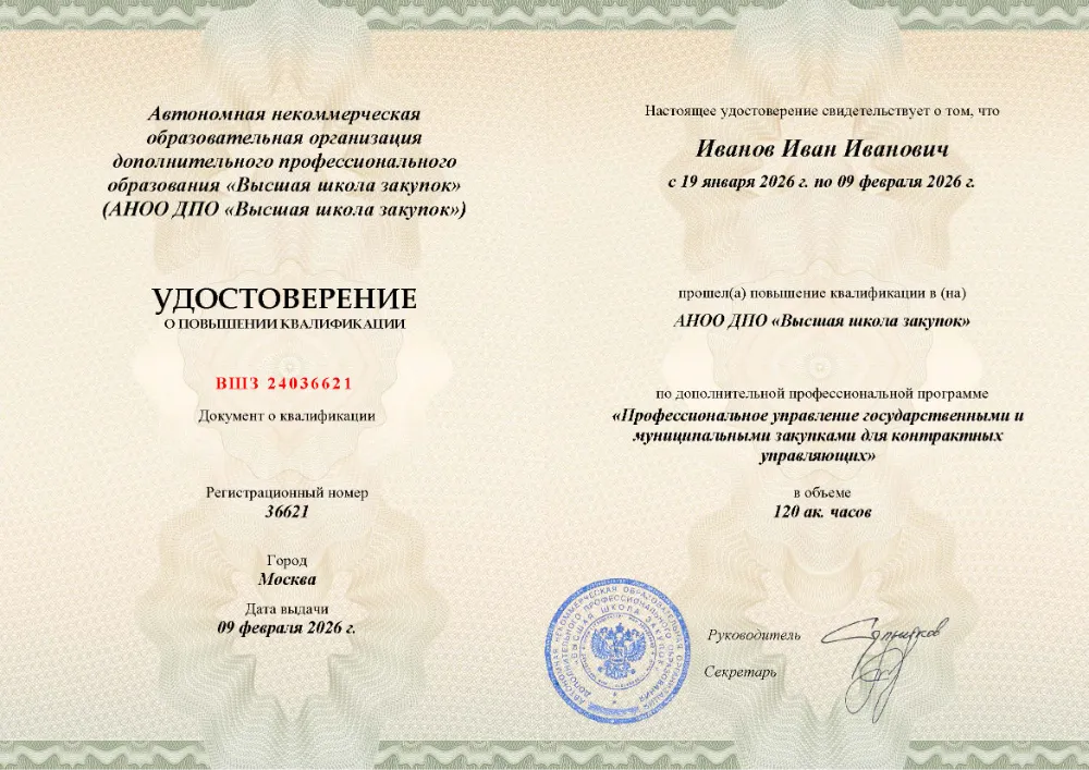 Вы получаете официальное удостоверение о повышении квалификации. Высшая школа закупок (fz44.org) обеспечивает передачу данных в реестр ФИС ФРДО, подтверждая соответствие вашей подготовки в Орле требованиям Минтруда.